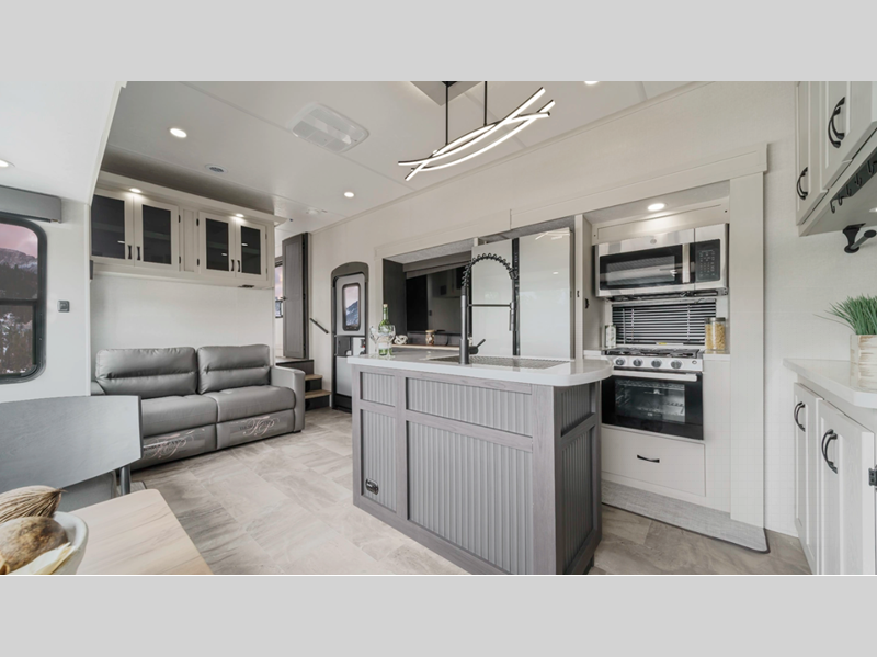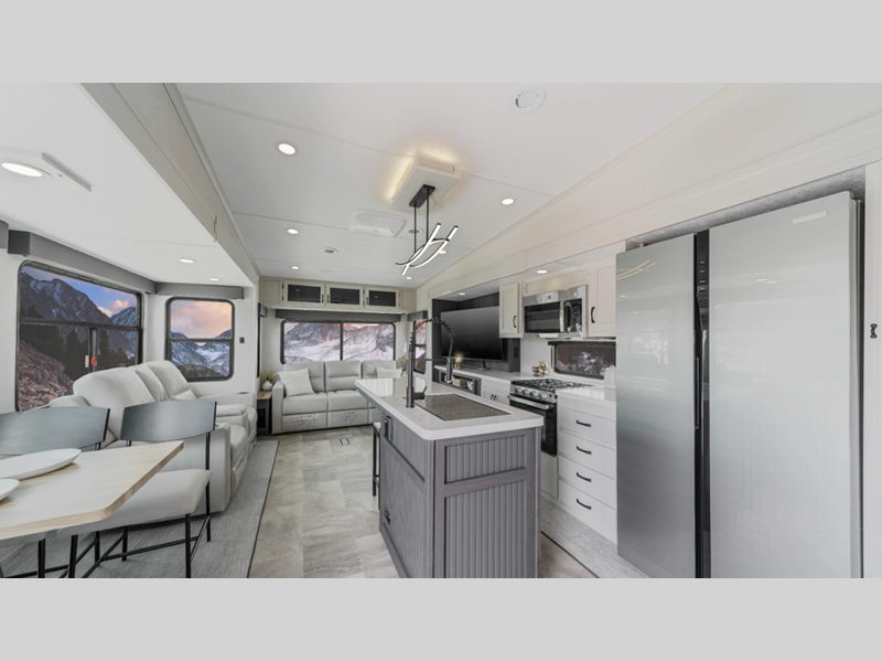 Sleeps 4 Slides 3 Length 34 ft 8 in Ext Width 8 ft Ext Height 12 ft 10 in Interior Color Linen, Carbon Hitch Weight 1935 lbs GVWR 12000 lbs Dry Weight 9574 lbs Cargo Capacity 2426 lbs Fresh Water Capacity 48 gals Grey Water Capacity 90 gals Black Water Capacity 45 gals Tire Size 15" Available Beds Queen Refrigerator Type Side by Side Stainless Glass 12V Refrigerator Size 16 cu ft Cooktop Burners 3 Number of Awnings 1 Water Heater Type On Demand AC BTU 27000 btu TV Info LR 50" 4K Smart LED TV Awning Info 15' Electric with LED Light Strip Axle Count 2 Washer/Dryer Available Yes Shower Type Standard Electrical Service 50 amp Similar Floorplans