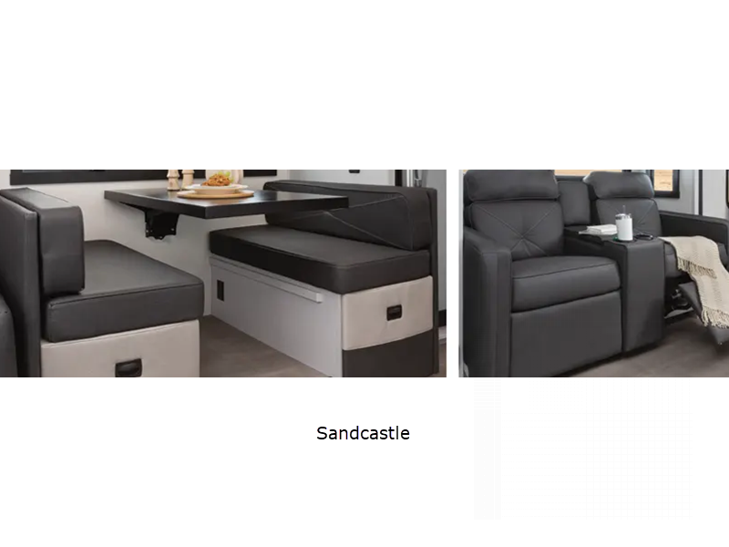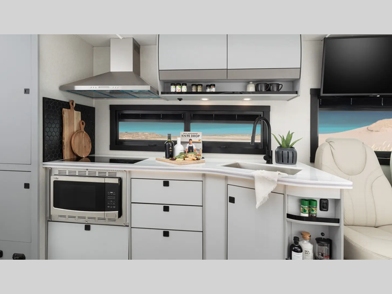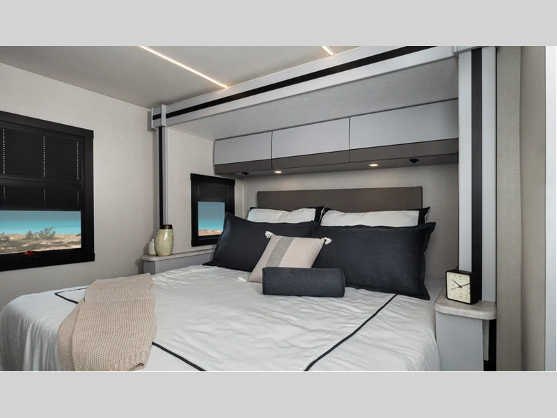 You will love the interior with its stainless steel appliances, modern decor, and generous cabinet space for all your belongings. There are also stylish square windows with day/night shades that will provide better views of your landscapes and an Easy Clean cockpit floor. Automatic leveling jacks also come standard on most models, along with a power patio awning, radius trunk doors, and an 8,000 lb. towing hitch for your hauling needs.