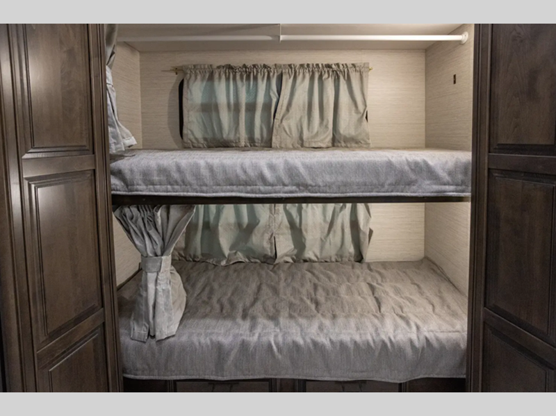 Sleeps 10 Slides 3 Length 44 ft 11 in Ext Width 8 ft 4 in Ext Height 12 ft 9 in Int Height 7 ft Exterior Color Blue Granite, Carmine, Ming Blue, Moonstone Metallic, Mocha Steel Hitch Weight 15000 lbs GVWR 47000 lbs Fresh Water Capacity 103 gals Grey Water Capacity 66 gals Black Water Capacity 42 gals Tire Size 22.5" Generator 10kW Onan Fuel Type Diesel Chassis Freightliner XCR Raised Rail Horsepower 450 hp Fuel Capacity 150 gals Wheelbase 294 in Number Of Bunks 3 Available Beds Tilt-A-View King Torque 1250 ft-lb Refrigerator Type Residential French Door Refrigerator Size 23 cu ft Convection Cooking Yes Cooktop Burners 2 Number of Awnings 2 Axle Weight Front 17000 lbs Axle Weight Rear 30000 lbs Water Heater Type Oasis Hydronic Continuous AC BTU 45000 btu TV Info LR 50" TV, BR 43" LED TV, Cab 32" LED TV, Bunks (2) 22" LED TV, Exterior 40" LED TV Awning Info 18' Carefree Latitude with LED Lights & Wind Sensor Washer/Dryer Available Yes Gross Combined Weight 62000 lbs Shower Type Standard Electrical Service 50 amp Similar Floorplans