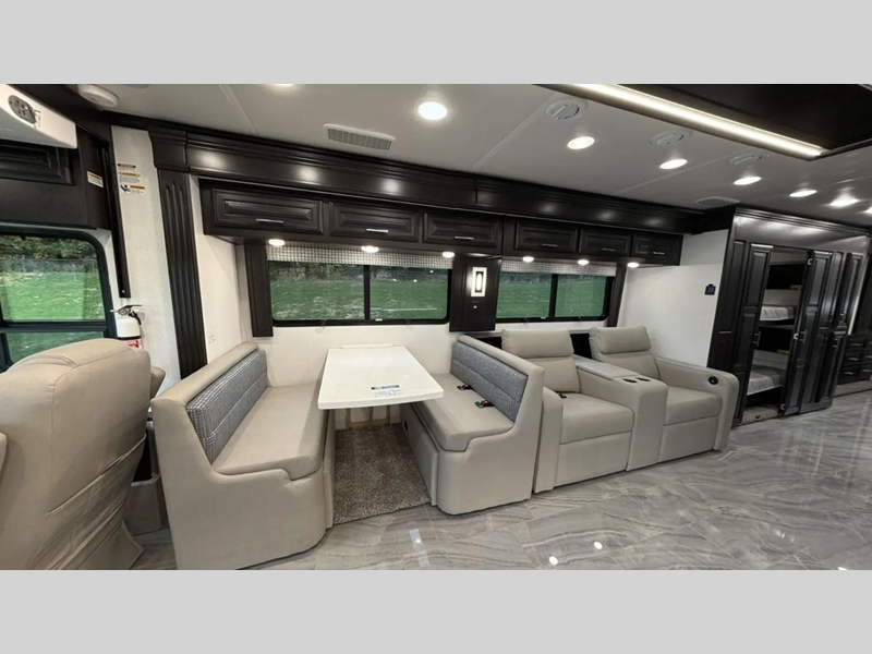 Sleeps 9 Slides 5 Length 44 ft 11 in Ext Width 8 ft 4 in Ext Height 12 ft 9 in Int Height 7 ft Exterior Color Blue Granite, Carmine, Ming Blue, Moonstone Metallic, Mocha Steel Hitch Weight 15000 lbs GVWR 47000 lbs Fresh Water Capacity 103 gals Grey Water Capacity 66 gals Black Water Capacity 42 gals Tire Size 22.5" Generator 10kW Onan Fuel Type Diesel Engine Cummins ISL Chassis Freightliner XCR Raised Rail Horsepower 450 hp Fuel Capacity 150 gals Wheelbase 294 in Number Of Bunks 3 Available Beds Tilt-A-View King Torque 1250 ft-lb Refrigerator Type Residential French Door Refrigerator Size 23 cu ft Convection Cooking Yes Cooktop Burners 2 Number of Awnings 2 Axle Weight Front 17000 lbs Axle Weight Rear 30000 lbs Water Heater Type Oasis Hydronic Continuous AC BTU 45000 btu TV Info LR 50" LED TV, BR 43" LED TV, Cab 32" LED TV, Bunks (2) 22" LED TV, Exterior 40" LED TV Awning Info 16' 6" Carefree Latitude with LED Lights & Wind Sensor Washer/Dryer Available Yes Gross Combined Weight 62000 lbs Shower Type Standard Electrical Service 50 amp Similar Floorplans