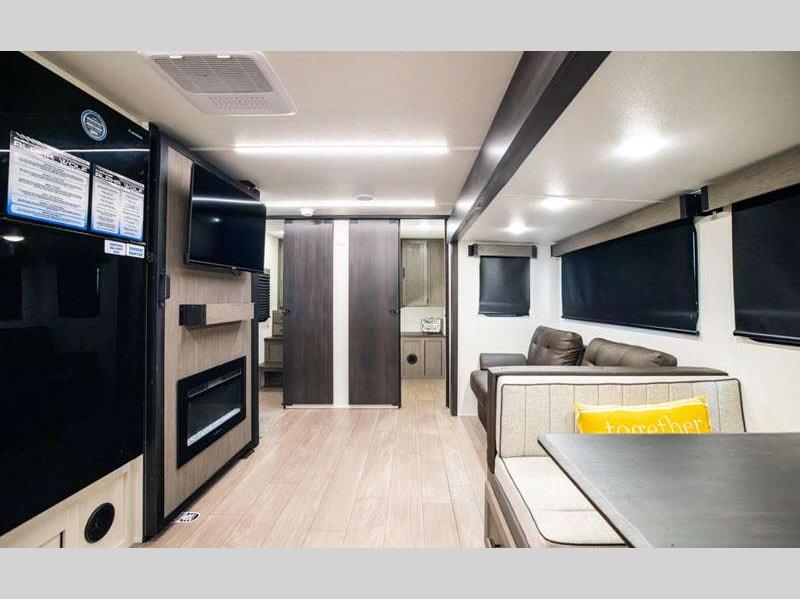 Sleeps 4 Slides 2 Length 34 ft 6 in Ext Width 8 ft Ext Height 11 ft 2 in Hitch Weight 1080 lbs GVWR 9750 lbs Dry Weight 7258 lbs Cargo Capacity 2492 lbs Fresh Water Capacity 81 gals Grey Water Capacity 70 gals Black Water Capacity 35 gals Available Beds Queen Refrigerator Type 12V Residential Style Refrigerator Size 10 cu ft Cooktop Burners 3 Number of Awnings 2 Water Heater Type On Demand Tankless AC BTU 15000 btu TV Info LED TV Awning Info 11' & 9' Axle Count 2 Shower Type Radius Electrical Service 30 amp Solar Wattage 100 watts Similar Floorplans