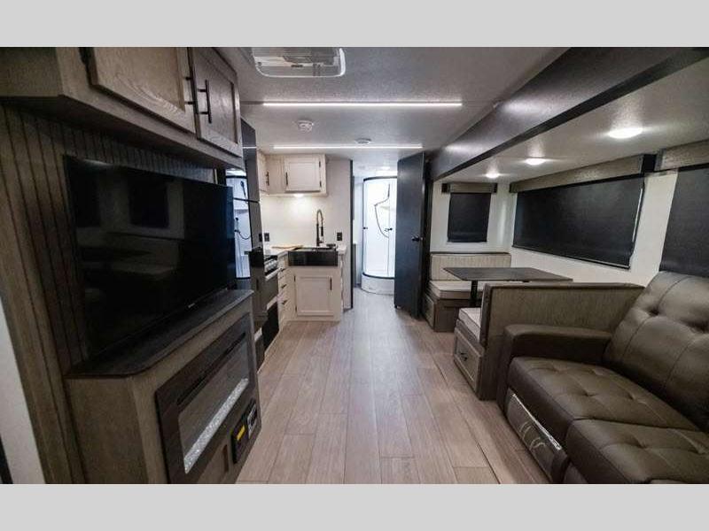 Sleeps 8 Slides 1 Length 30 ft 9 in Ext Width 8 ft Ext Height 11 ft Hitch Weight 945 lbs GVWR 7945 lbs Dry Weight 6403 lbs Cargo Capacity 1542 lbs Fresh Water Capacity 81 gals Grey Water Capacity 35 gals Black Water Capacity 35 gals Number Of Bunks 2 Available Beds Queen Refrigerator Type 12V Residential Style Refrigerator Size 10 cu ft Cooktop Burners 3 Number of Awnings 1 Water Heater Type On Demand Tankless AC BTU 15000 btu TV Info LED TV Awning Info 18' Axle Count 2 Shower Type Tub/Shower Combo Electrical Service 50 amp Solar Wattage 100 watts Similar Floorplans