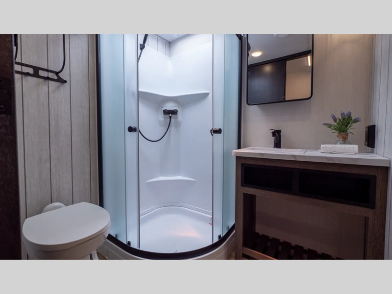 Each model features a king bed slide out, which is what set these Suite models apart from the Arctic Wolf models. Along with the added bedroom space, you'll also enjoy a second A/C unit, more storage space in the bedroom, and a "SuperStor" dual cavern basement storage compartment so nothing gets left behind. You'll feel right at home with the kitchen appliance and hardware package, plus carpetless floor design, and floor level motion sensing lights in the bedroom, bathroom, and interior steps.