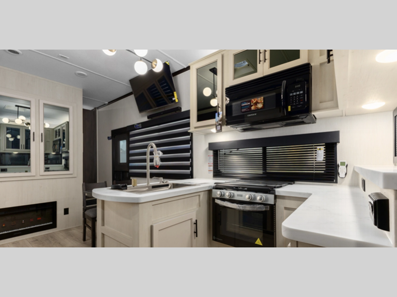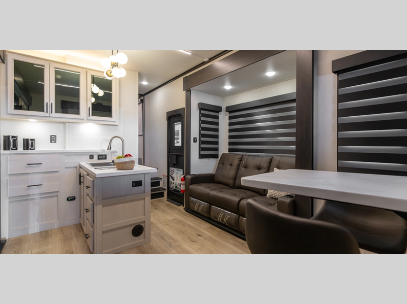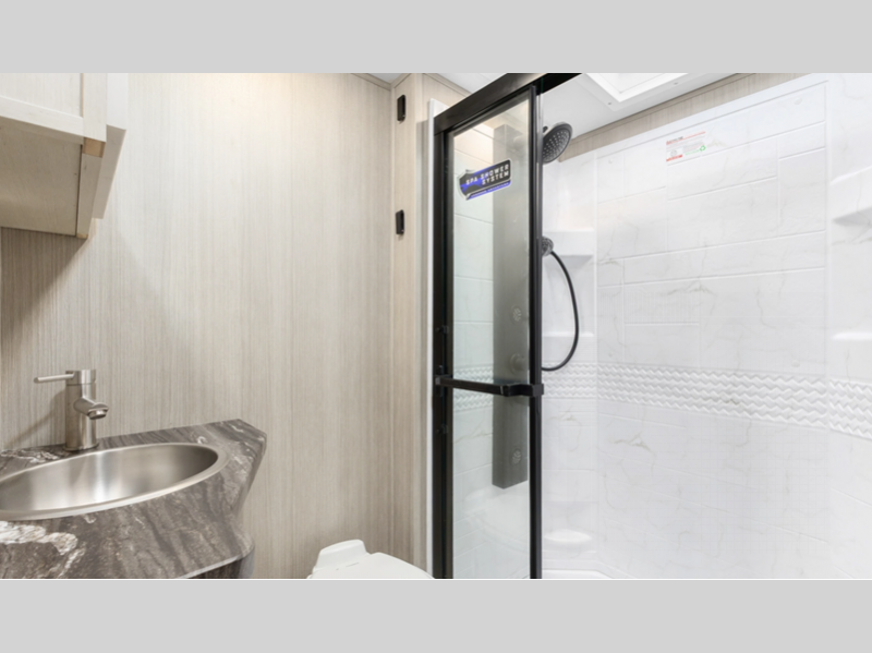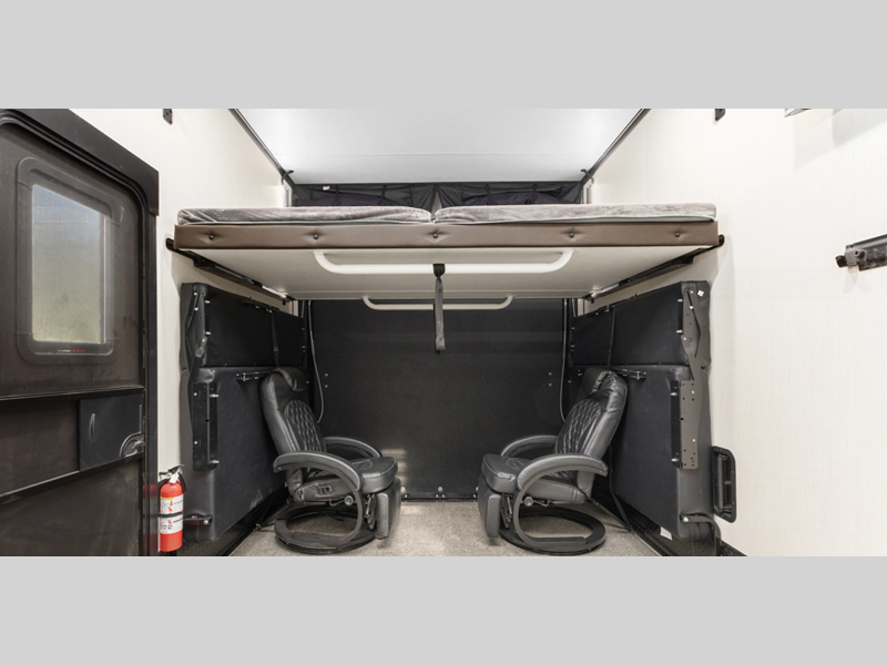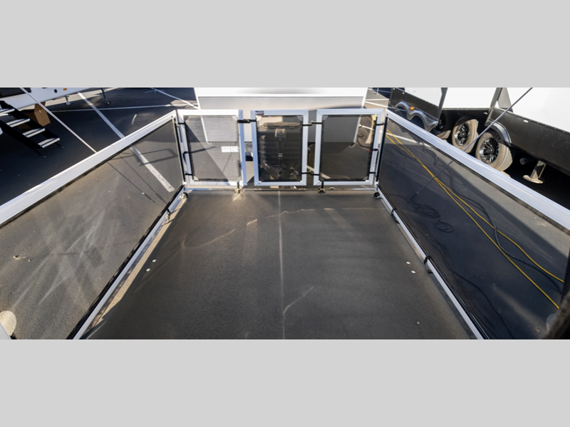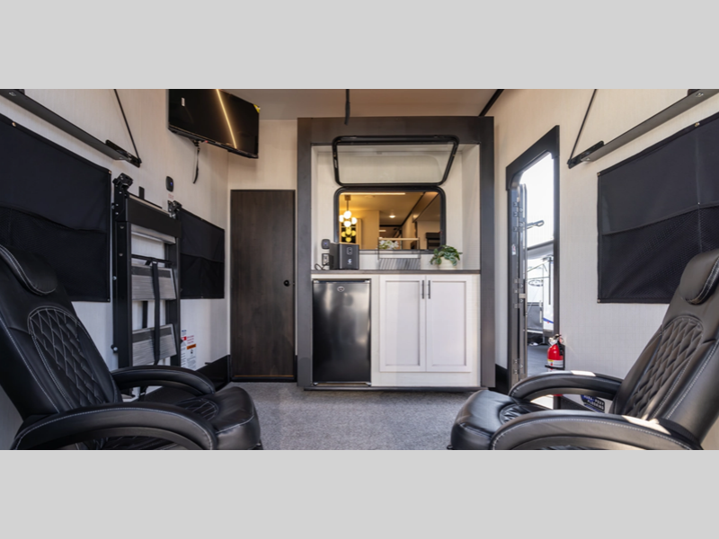 There is a 3,000 lb. rated ramp door on each model, along with DuraPoxy gas/oil resistant flooring, and 5,000 lbs. tie-downs to keep your toys secure on the way to the campground. You can enjoy your toy hauler for years to come thanks to the aluminum frame sidewalls and radius PVC walk-on roof, and the 102" wide body construction will make it easier than ever to load up dirt bikes, four-wheelers, or kayaks! Inside, you'll love the zebra shades in the living areas, the glass shower doors, the quick set garage bed system, and many more comforts!