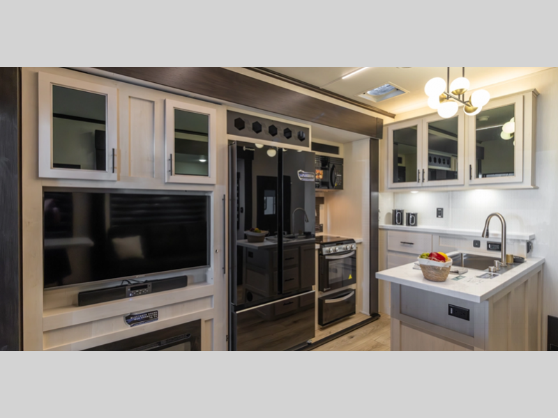 Sleeps 8 Slides 3 Length 44 ft 2 in Ext Width 8 ft 6 in Ext Height 13 ft 4 in Hitch Weight 3050 lbs GVWR 17050 lbs Dry Weight 13564 lbs Cargo Capacity 3486 lbs Fresh Water Capacity 160 gals Grey Water Capacity 80 gals Black Water Capacity 100 gals Tire Size 16" Furnace BTU 35000 btu Fuel Capacity 30 gals Number Of Bunks 1 Available Beds King Refrigerator Type 12V Residential Style Refrigerator Size 17 cu ft Cooktop Burners 3 Number of Awnings 2 Axle Weight 7000 lbs Garage Size 13 ft Water Heater Type Tankless On Demand AC BTU 30000 btu Awning Info 10' and 16' Power w/LED Lights Axle Count 2 Washer/Dryer Available Yes Shower Type Radius Electrical Service 50 amp Solar Wattage 200 watts Similar Floorplans